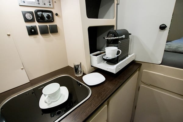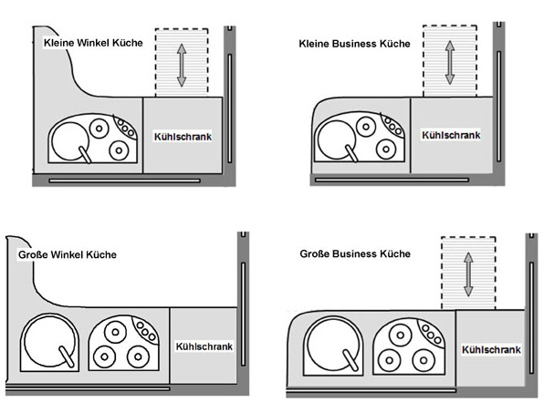 Bei den Businessvarianten ist die Küche auf das Wesentliche reduziert - kompakter geht es nicht. Die Arbeitsfläche wird unter dem Kühlschrank ausgezogen.