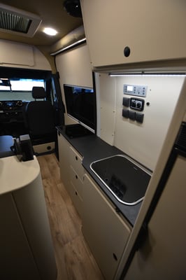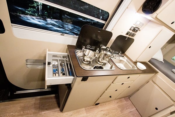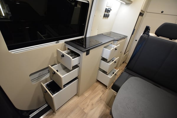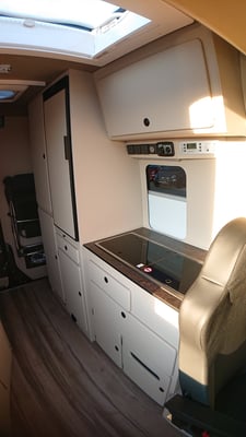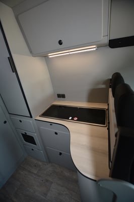 Bei den Life Varianten schließt die Küche an die hintere Sitzbank an. Dadurch ergibt sich die ergonomische Winkelküchen-Anordnung.