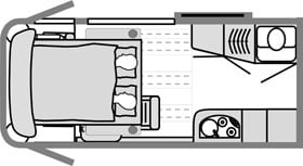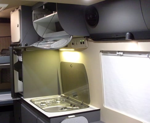 Kompressor-Kühlschrank, 65 Liter und ** Kühlfach, 2-Flammen-Propangasherd und Edelstahl-Waschbecken mit Sicherheitsglasabdeckung, Chromarmatur mit Einhebelmischer, Dachschrank mit Besteck-, Gläser- und Tellerfach, 12 V und 230 V Steckdose, LED-Leuchte.