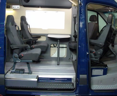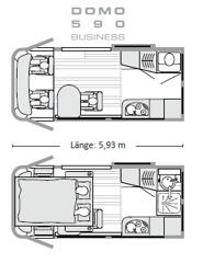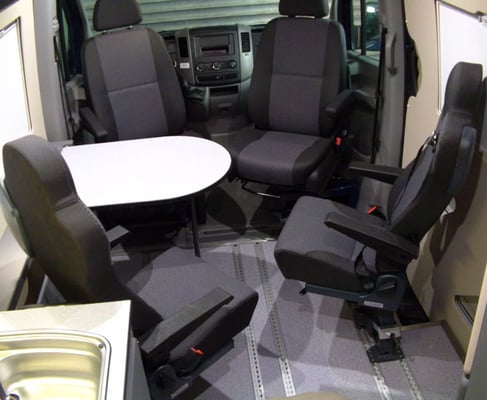 Die Wohnmobilfunktionen sind so angeordnet, das der freie Raum durch den Funktionsboden variabel genutzt werden kann. Grundgedanke des DOMO Business sind zahlreiche Nachfragen nach einem multifunktionalen Fahrzeug für Freizeit und Beruf. Wir haben die komplizierte Wohnmobiltechnik auf engstem Raum zusammengefasst. Dadurch sind auch die Radkästen sinnvoll verbaut. Die frei nutzbare Fläche entsteht so im vorderen Bereich. Durch die Cockpitsitze kann hier leicht der Sitz- und Wohnbereich realisiert werden.