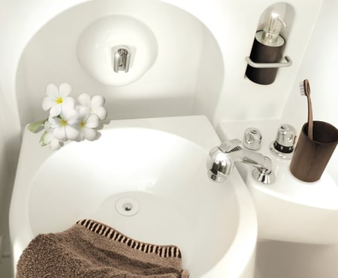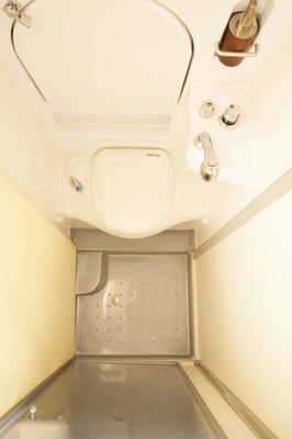 Variable Nasszelle mit Waschbecken, Dusche mit fester Duschabtrennung, Duscharmatur mit Wassersparbrause, Kassettentoilette Thetford, 230 V Steckdose im Spiegelschrank integriert, Außendusche mit Warmwasser, Chromarmatur mit Einhebelmischer, Pumpe zur Duschwasserabsaugung, Badentlüftung (für Gerüche, Feuchtigkeit, Luftaustausch im DOMO).