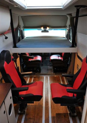 Funktionsboden für individuelle Bestuhlung , Zusatzsitz TÜV/M1 geprüft,Schwanenhals-Leseleuchte und Deckenleuchten in stromsparender LED-Technik, PVC-Fußboden, Tresor in Trittstufe integriert ,Möbelbau in aufwendiger Kaschiertechnik, Seitenelement mit Tisch,großes Dachfenster (Seitz Midi -Heki-Elektro) mit Verdunkelung und Moskitoschutz, elektrischer Dachlüfter, regelbar mit Thermostat und Verdunkelung, Befestigungsset und Ablagen in Küche, Bad und Schränken.