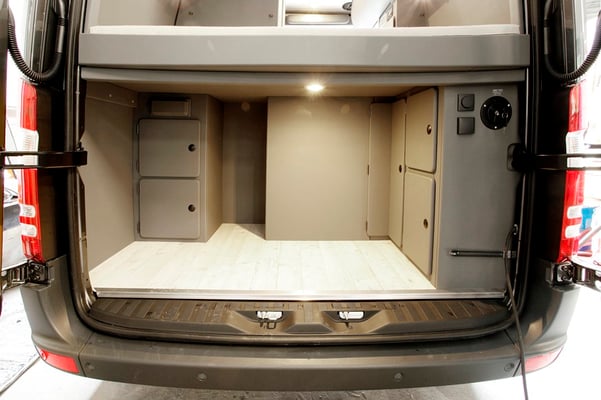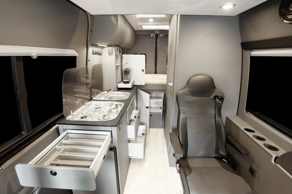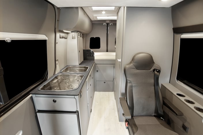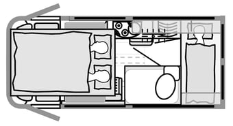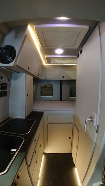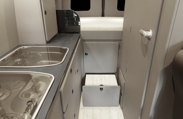 Kompressor-Kühlschrank , 2-Flammen-Propangasherd und Edelstahl-Waschbecken mit Sicherheitsglasabdeckung, Chromarmatur mit Einhebelmischer, Dachschrank, 12 V und 230 V Steckdose, LED-Leuchte.