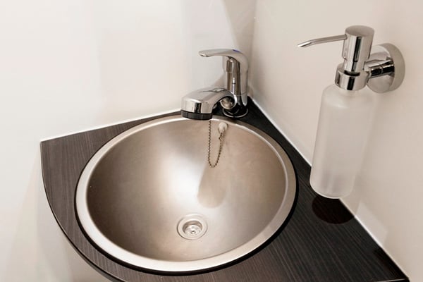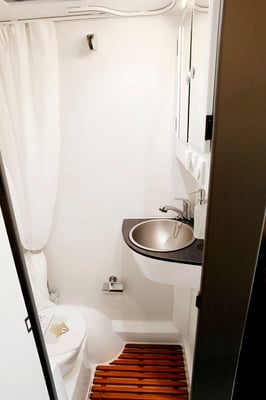 Festbad mit Edelstahlwaschbecken, Duscharmatur mit Wassersparbrause, Kassettentoilette mit Keramikinlay, 230 V Steckdose im Spiegelschrank integriert, Außendusche mit Warmwasser, Chromarmatur mit Einhebelmischer, Pumpe zur Duschwasserabsaugung, Badentlüftung (für Gerüche, Feuchtigkeit, Luftaustausch im DOMO), hochwertiges Duschrost aus Bangkirai.